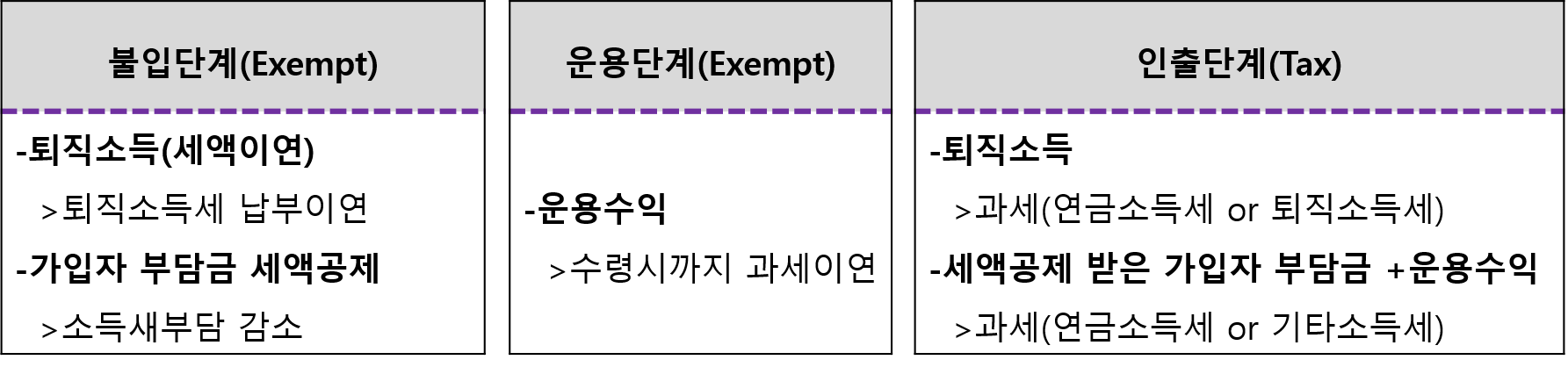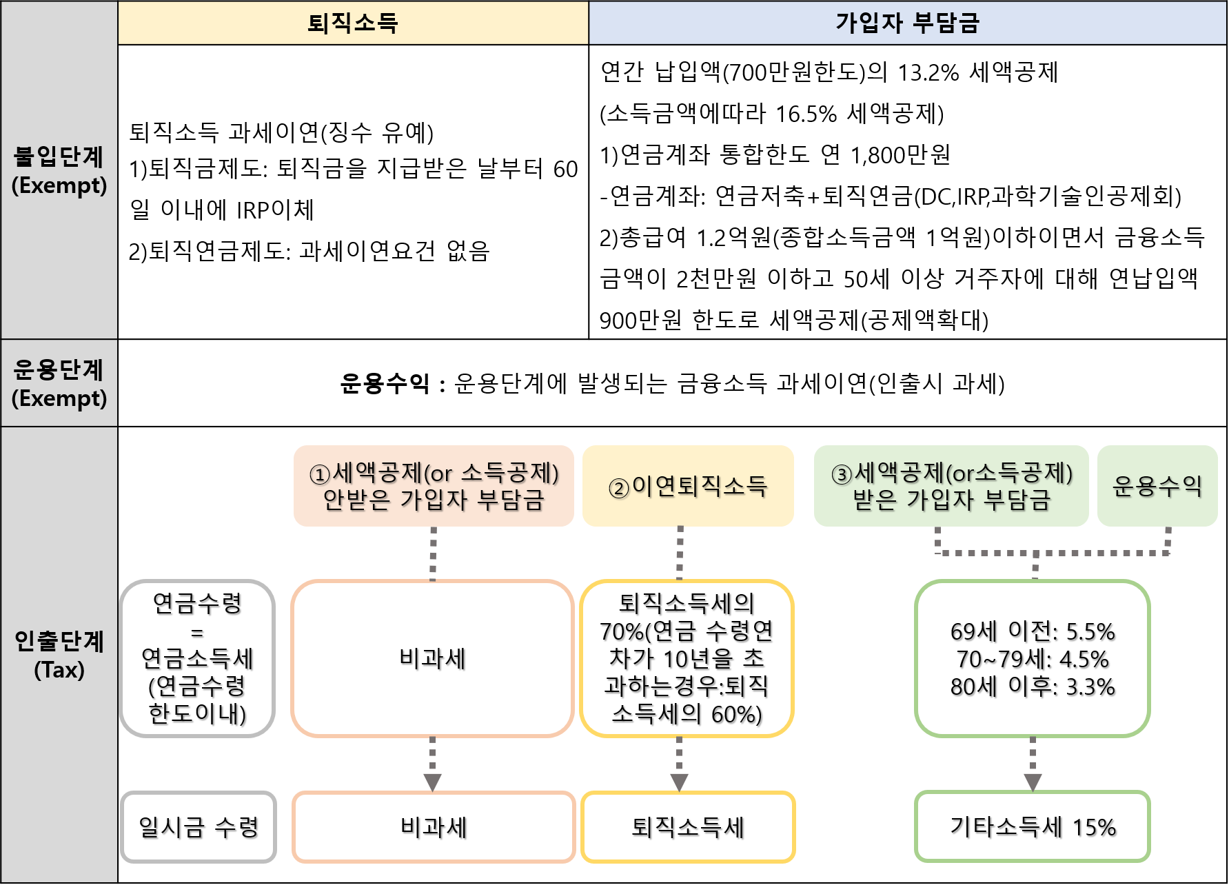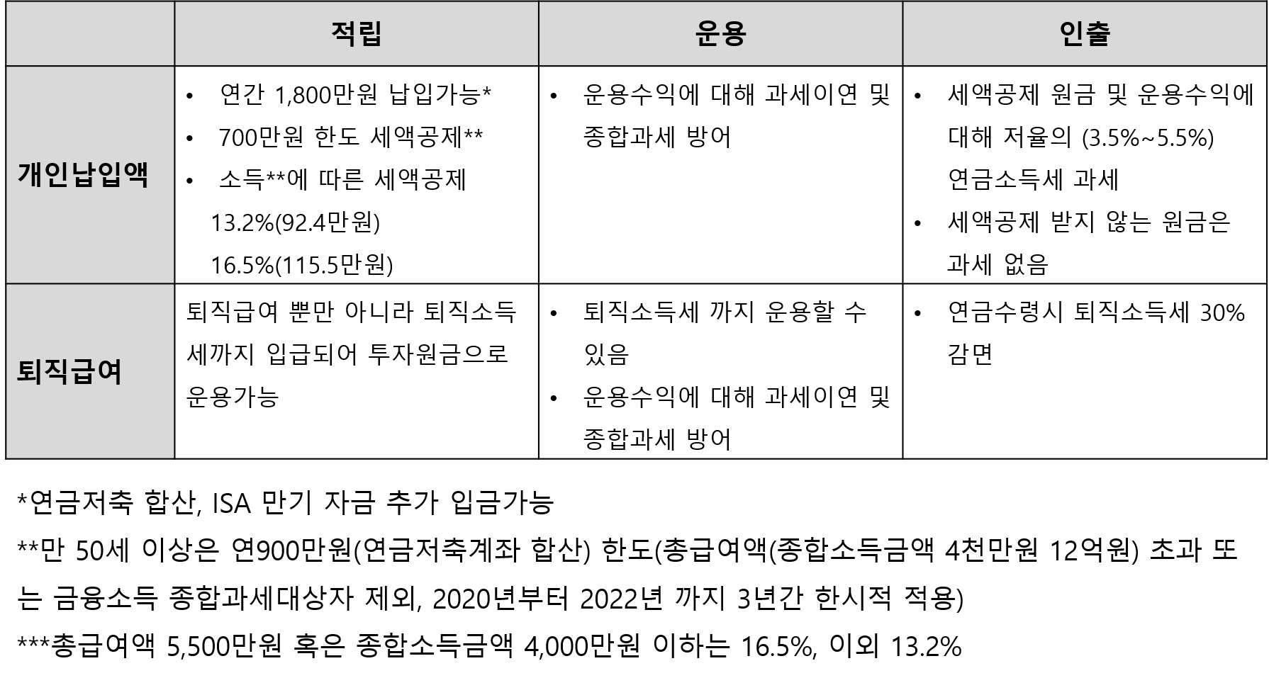또한 운용기간 중에 발생한 수익에 대해서도 연금 수령 시 3.3~5.5%의 저율과세를 하므로 일반 과세 금융상품에 적용되는 15.4%의 세금(이자소득세)에 대해 적은 세금을 납부하게 됩니다.
